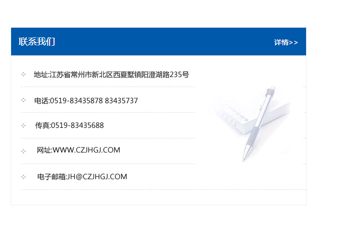 傳真:0519-83435688    郵編:213135    網址:WWW.czjhgj_com.mnigo.com    電子郵箱:JH@czjhgj_com.mnigo.com
